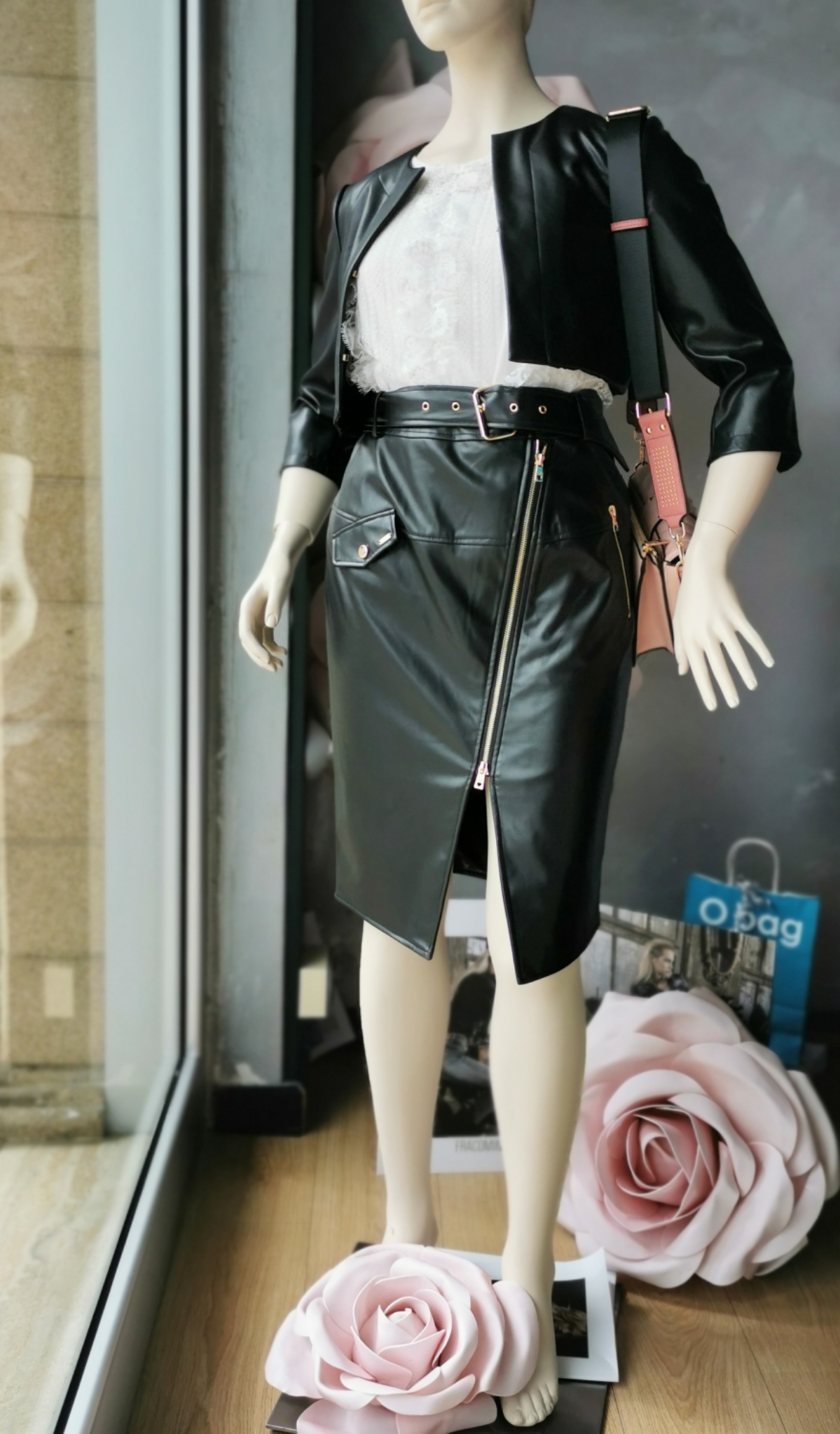 Gonna skinny a tubino midi in eco pelle, vita alta, con zip obliqua metallica, con tasche sui fianchi e con cintura abbinata.